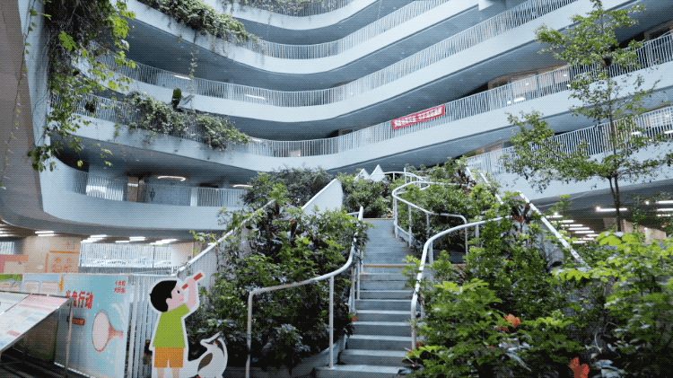 紅嶺實(shí)驗(yàn)小學(xué)內(nèi)部 (圖源:一條) 學(xué)校還有下沉庭院,當(dāng)舉辦文體活動(dòng)時(shí),就把庭院變身為舞臺(tái),與兩座U形階梯一同開(kāi)啟劇場(chǎng)模式。此外,還有一圈可以抬升到半空的200米環(huán)形跑道,與主教學(xué)樓連通,方便學(xué)生兩邊穿行。到處都有立體綠化、盆栽綠植,讓孩子們親近自然。